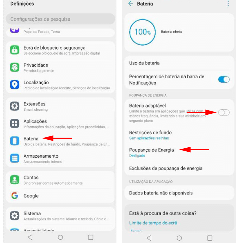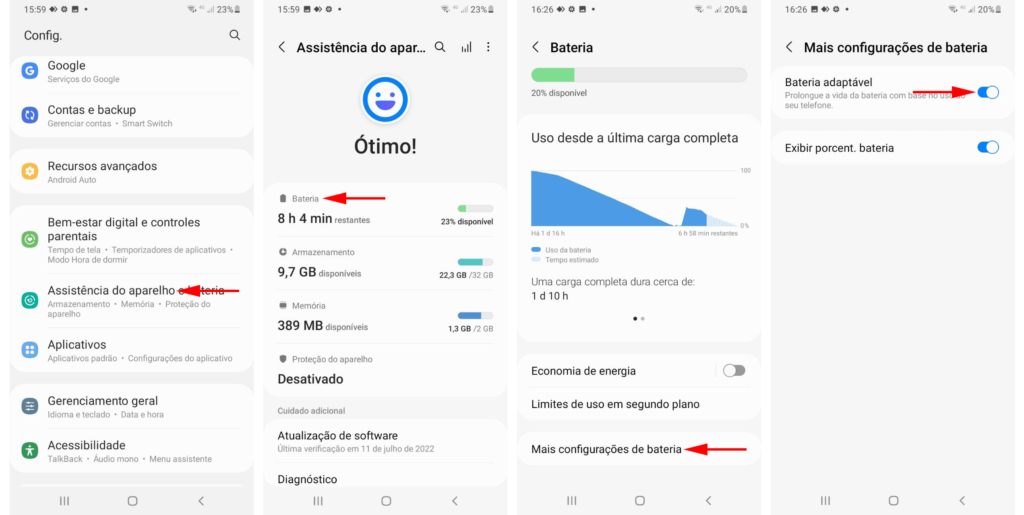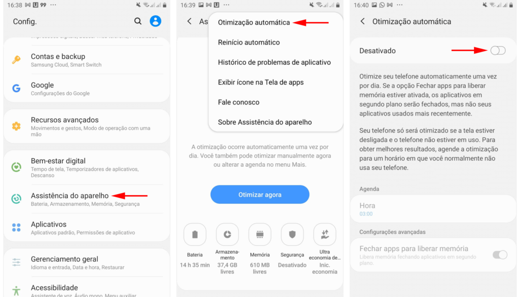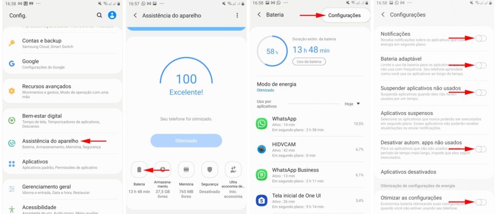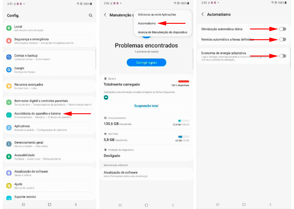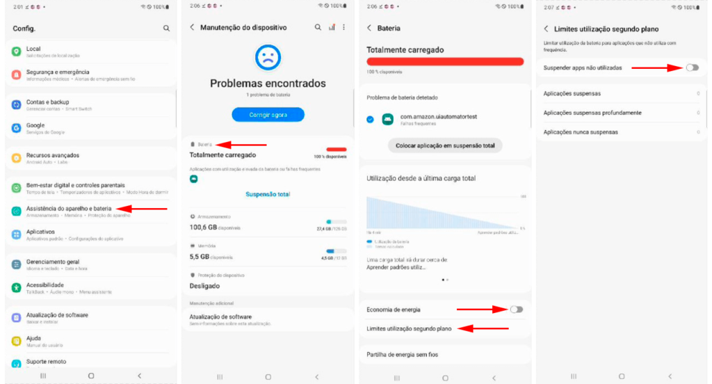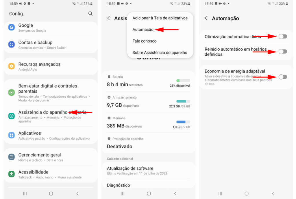 Para desabilitar a otimização automática de bateria e a economia de energia adaptável em aparelhos Samsung siga esses passos: