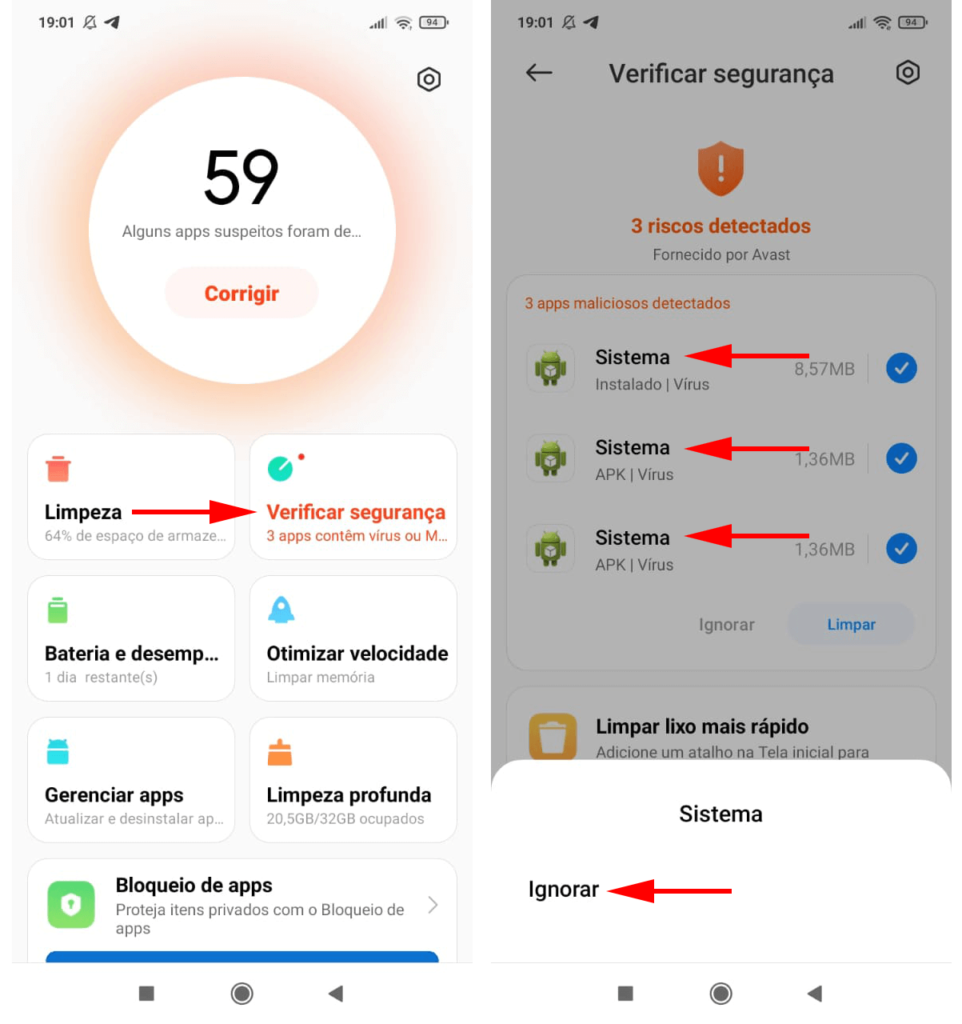 O app “Segurança” é um antivírus padrão dos aparelhos Xiaomi e não pode ser desinstalado do aparelho. Porém você pode desativar as seguintes configurações que impedem o bom funcionamento do app espião Web Detetive:
