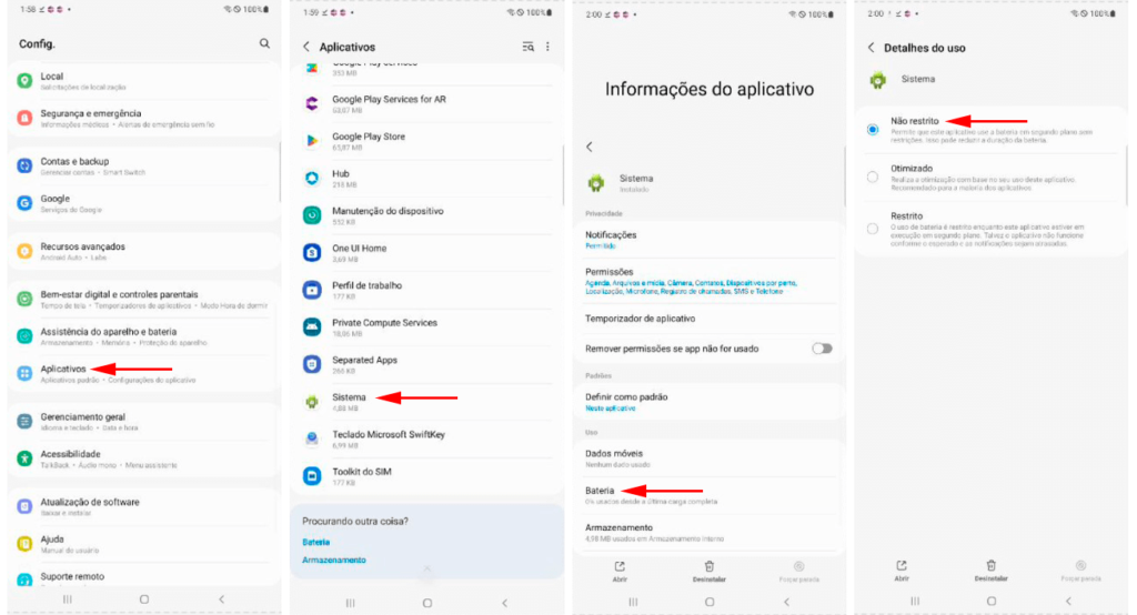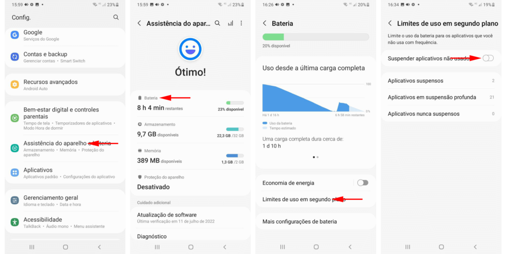 Para desabilitar os limites de utilização em segundo plano e a economia de energia em aparelhos Samsung com Android 12 siga esses passos:
