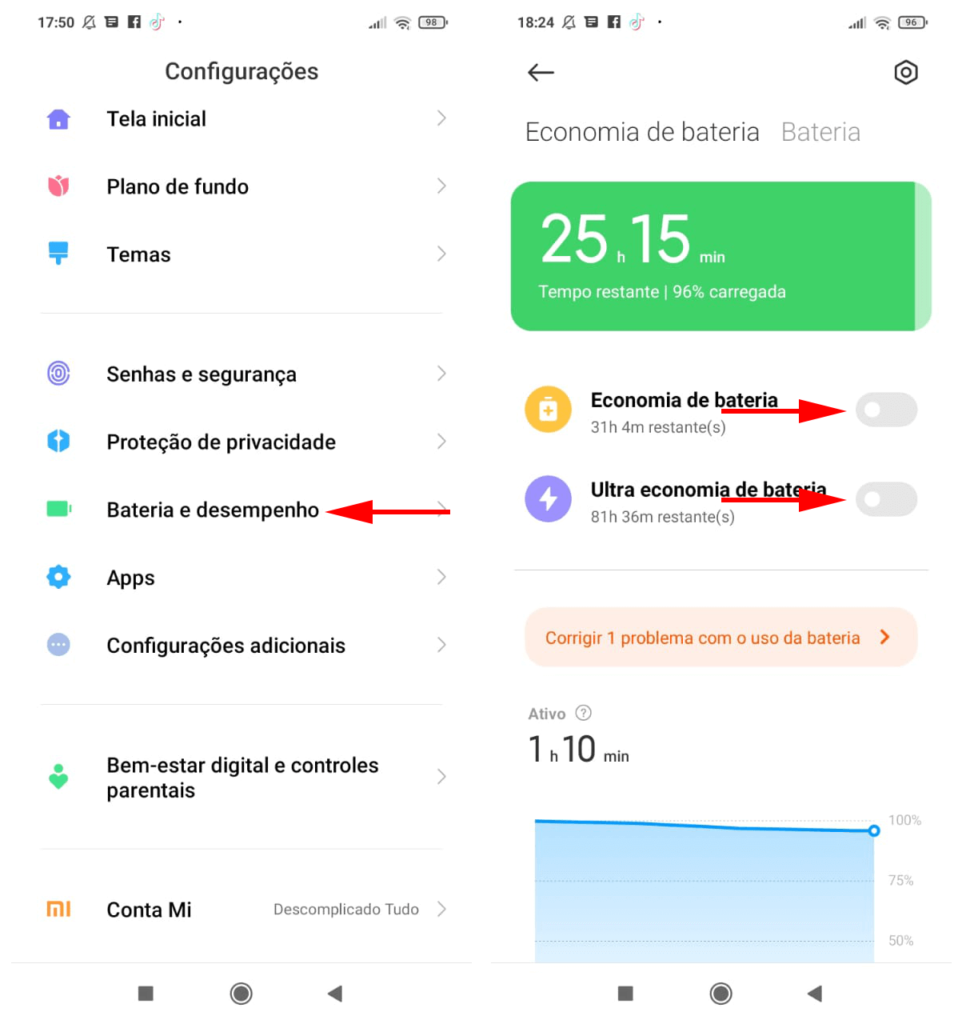 Em continuação a essas configurações, desabilite também a economia de bateria e a ultra economia de bateria do aparelho Xiaomi dessa maneira: